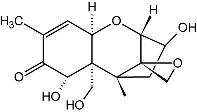 嘔吐毒素主體成分為DON(deoxynivalenol, 脫氧雪腐鐮刀菌烯醇),屬于單端孢霉烯族化合物,主要由禾谷鐮刀菌、尖孢鐮刀菌、串珠鐮刀菌、擬枝孢鐮刀菌、粉紅鐮刀菌、雪腐鐮刀菌等鐮刀菌產(chǎn)生。另外,頭孢菌屬、漆班菌屬、木霉屬等的菌株都可產(chǎn)生該毒素。單端孢霉烯族毒素共有150多種,是一類強(qiáng)有力免疫抑制劑,所引起典型癥狀是采食量降低,所以這類毒素又叫飼料拒食毒素。嘔吐毒素(DON)是其中最重要一種毒素,主要來自鐮刀菌屬(Fusarium),尤其是禾谷鐮刀菌(Fusariumgraminearum)和黃色鐮刀菌(Fusarium culmorum)。由于它可以引起豬的嘔吐,故又名嘔吐毒素(vomitoxin,VT)。由于它可以引起豬的嘔吐而得名,對人體有一定危害作用,歐盟分類標(biāo)準(zhǔn)為三級(jí)致癌物。