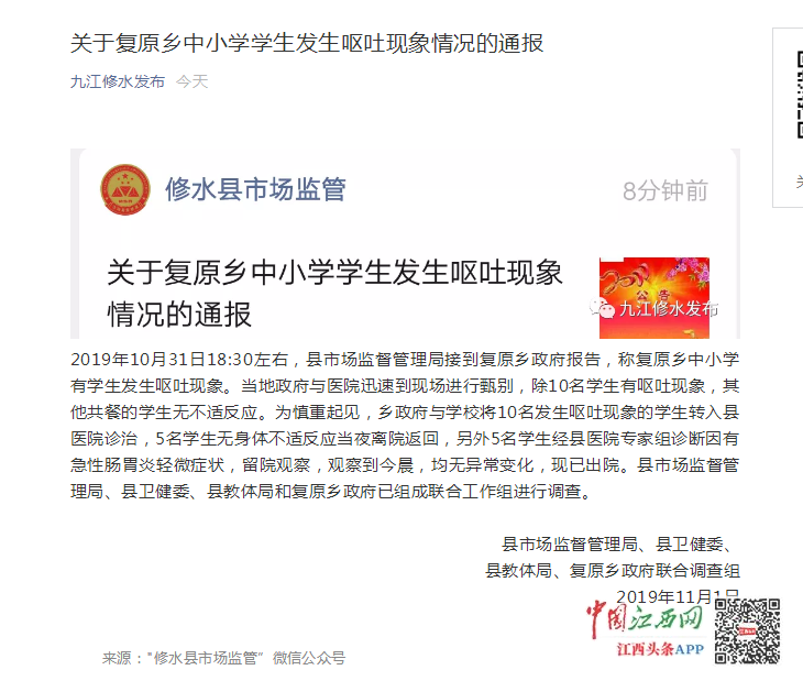 11月1日上午,修水縣市場監管局管理局發布通報稱,2019年10月31日18:30左右,縣市場監督管理局接到復原鄉政府報告,稱復原鄉中小學有學生發生嘔吐現象。當地政府與醫院迅速到現場進行甄別,除10名學生有嘔吐現象,其他共餐的學生無不適反應。為慎重起見,鄉政府與學校將10名發生嘔吐現象的學生轉入縣醫院診治,5名學生無身體不適反應當夜離院返回,另外5名學生經縣醫院專家組診斷因有急性腸胃炎輕微癥狀,留院觀察,觀察到今晨,均無異常變化,現已出院??h市場監督管理局、縣衛健委、縣教體局和復原鄉政府已組成聯合工作組進行調查。