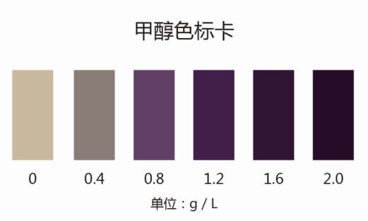 2.1:20分鐘后觀察孔中顏色的深淺,顏色越深,表示酒樣中甲醇的含量越高;(對照色卡上的標示值可知酒樣中甲醇的大致含量)