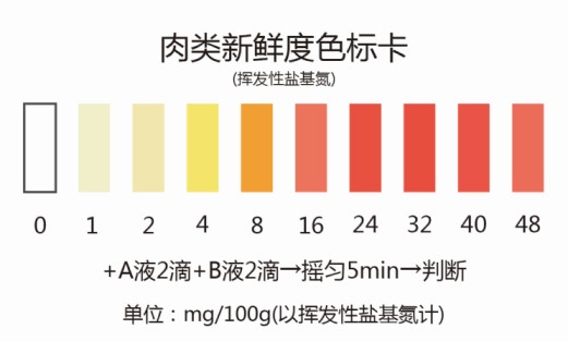 比色卡為每100g肉品中揮發性鹽基氮的大致含量,可根據下列指標確定肉品的新鮮度:
