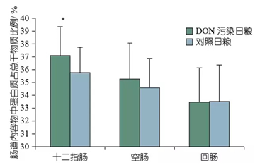 由于血漿氨基酸或蛋白質(zhì)泄漏進(jìn)腸道,對(duì)上皮細(xì)胞的這些毒性作用會(huì)導(dǎo)致腸腔內(nèi)蛋白質(zhì)供應(yīng)量的提高。為了增殖并引起壞死性腸炎,產(chǎn)氣莢膜梭菌需要蛋白質(zhì)。肉雞在飼喂受?chē)I吐毒素污染的日糧后,十二指腸內(nèi)容物中總蛋白質(zhì)濃度顯著提高(P = 0.023)(圖2)。這可能是由吸收不良——一種因腸屏障完整性改變而對(duì)營(yíng)養(yǎng)物質(zhì)消化或血漿氨基酸或蛋白質(zhì)在腸道中泄漏產(chǎn)生的負(fù)面影響。因此,這會(huì)產(chǎn)生一種有利于產(chǎn)氣莢膜梭菌大規(guī)模繁殖并隨后可引發(fā)壞死性腸炎的環(huán)境。