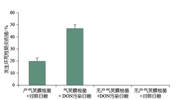 不同批次受污染的飼料中嘔吐毒素污染水平從(2884±800)μg/kg到(4384±1300)μg/kg不等。結(jié)果表明,飼喂受到嘔吐毒素污染的飼料會(huì)導(dǎo)致更多的肉雞患?jí)乃佬阅c炎,即在實(shí)驗(yàn)性接種產(chǎn)氣莢膜梭菌和喂給對(duì)照日糧的試驗(yàn)組中,(20±2.6)%的肉雞存在壞死性腸炎的病變;而在實(shí)驗(yàn)性接種產(chǎn)氣莢膜梭菌并飼喂被嘔吐毒素污染的飼料的試驗(yàn)組中,(47±3.0)%的肉雞患有壞死性腸炎(P<0.001)(圖1)。在不進(jìn)行實(shí)驗(yàn)性接種產(chǎn)氣莢膜梭菌的試驗(yàn)組中,試驗(yàn)肉雞沒(méi)出現(xiàn)病變。