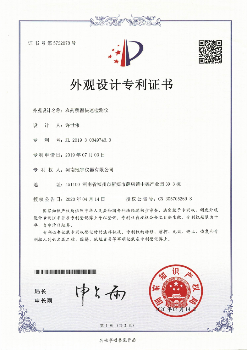近日,河南冠宇儀器有限公司(以下簡(jiǎn)稱(chēng):冠宇儀器)繼之前的多項(xiàng)軟件著作權(quán)證書(shū)及專(zhuān)利證書(shū)之后,又獲由國(guó)家知識(shí)產(chǎn)權(quán)局頒發(fā)的一項(xiàng)“農(nóng)藥殘留快速檢測(cè)儀外觀設(shè)計(jì)專(zhuān)利證書(shū)”,一系列的權(quán)威肯定,彰顯了冠宇儀器強(qiáng)大的技術(shù)研發(fā)能力,也體現(xiàn)出公司為客戶提供優(yōu)質(zhì)產(chǎn)品的強(qiáng)大決心。