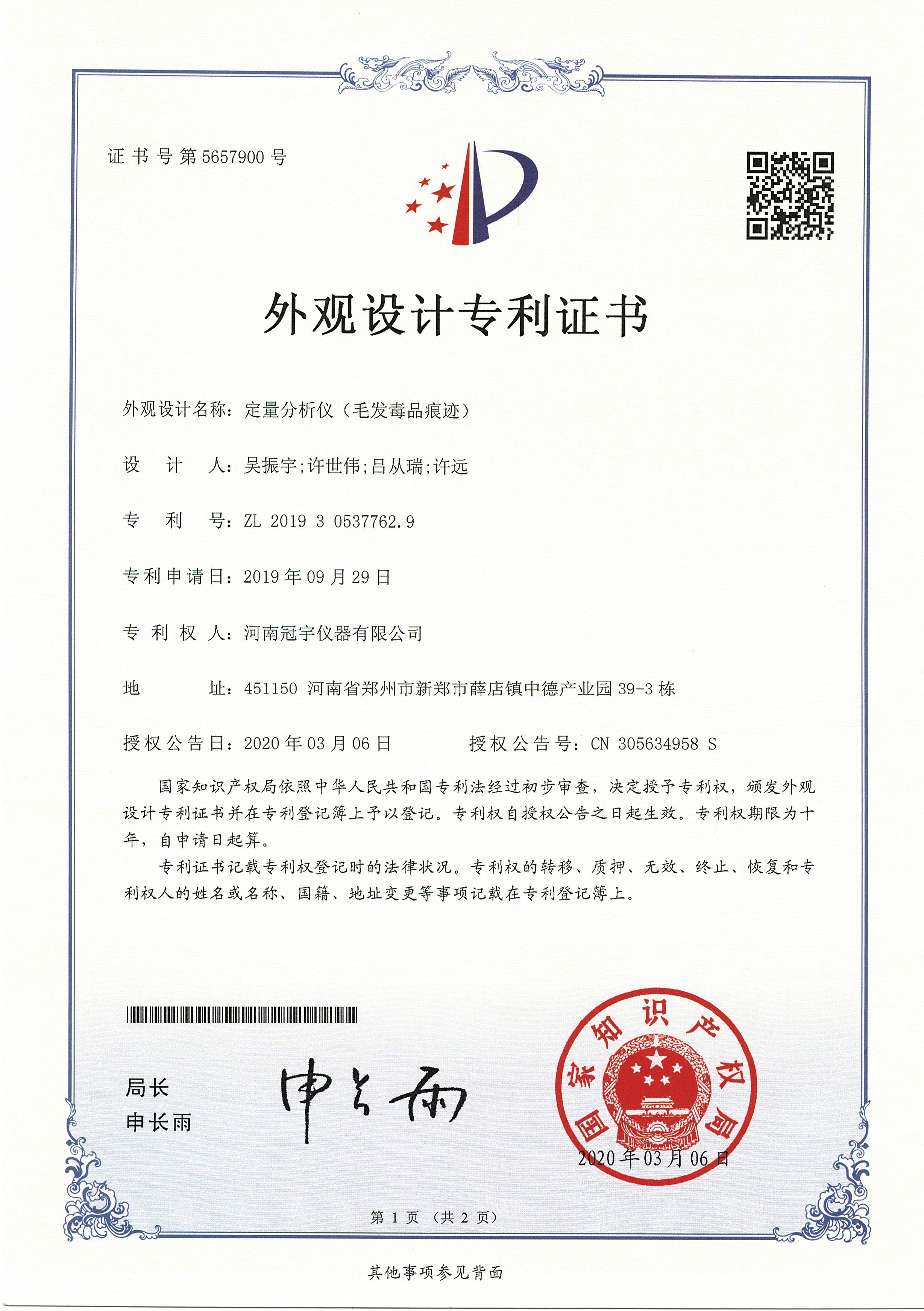 近日,河南冠宇儀器有限公司(以下簡稱:冠宇儀器)繼之前的多項軟件著作權證書及專利證書之后,又獲由國家知識產權局頒發的一項“定量分析儀(毛發毒品痕跡)外觀設計專利證書”,一系列的權威肯定,彰顯了冠宇儀器強大的技術研發能力,也體現出公司為客戶提供優質產品的強大決心。