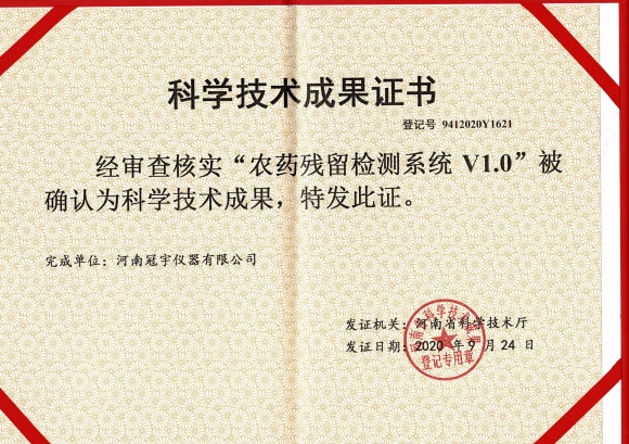 河南冠宇儀器有限公司(以下簡稱:冠宇儀器)繼多項軟件著作權證書、實用新型專利證書、計算機軟件著作權等一系列證書之后,又獲由河南省科學技術廳頒發的一項“農藥殘留檢測系統V1.0科學技術成果證書”,一系列的權威肯定,彰顯了冠宇儀器強大的技術研發能力,也體現出公司為客戶提供優質產品的強大決心。