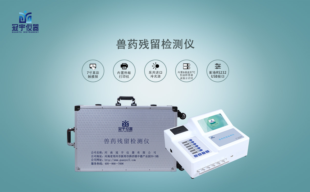 面對獸藥殘留不可忽視的傷害,河南冠宇儀器有限公司研制出一款獸藥殘留檢測儀可現場檢測食品、肉制品、糧食、化妝品、食用油等樣品中抗生素殘留、毒素、激素及非法添加。如:氯霉素、氰霉素、鹽酸克侖特羅、萊克多巴胺、沙丁胺醇、黃曲霉毒素等數十種項目。應用競爭抑制免疫層析的原理,通過檢測線熒光定量卡中的熒光強弱程度,定量分析待檢樣品中獸藥殘留。
