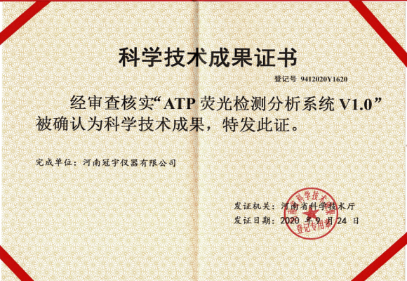 河南冠宇儀器有限公司(以下簡(jiǎn)稱:冠宇儀器)繼多項(xiàng)軟件著作權(quán)證書、實(shí)用新型專利證書、計(jì)算機(jī)軟件著作權(quán)等一系列證書之后,又獲由河南省科學(xué)技術(shù)廳頒發(fā)的一項(xiàng)“ATP熒光檢測(cè)分析系統(tǒng)V1.0科學(xué)技術(shù)成果證書”,一系列的權(quán)威肯定,彰顯了冠宇儀器強(qiáng)大的技術(shù)研發(fā)能力,也體現(xiàn)出公司為客戶提供優(yōu)質(zhì)產(chǎn)品的強(qiáng)大決心。
