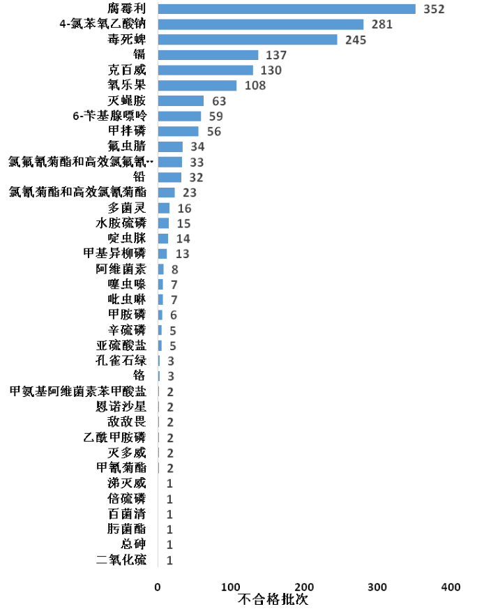 腐霉利、4-氯苯氧乙酸鈉、毒死蜱等農藥殘留超標為蔬菜產品抽檢主要不合格項。其中腐霉利殘留超標352批次,全部從韭菜中檢出;4-氯苯氧乙酸鈉殘留超標281批次,主要從黃豆芽、綠豆芽中檢出;毒死蜱殘留超標245批次,主要從芹菜、普通白菜中檢出。從蔬菜上禁用農藥檢出情況看,排在前五位的包括:毒死蜱,檢出245批次;克百威,檢出130批次;氧樂果,檢出108批次;甲拌磷,檢出56批次;氟蟲腈,檢出34批次(詳見圖1)。