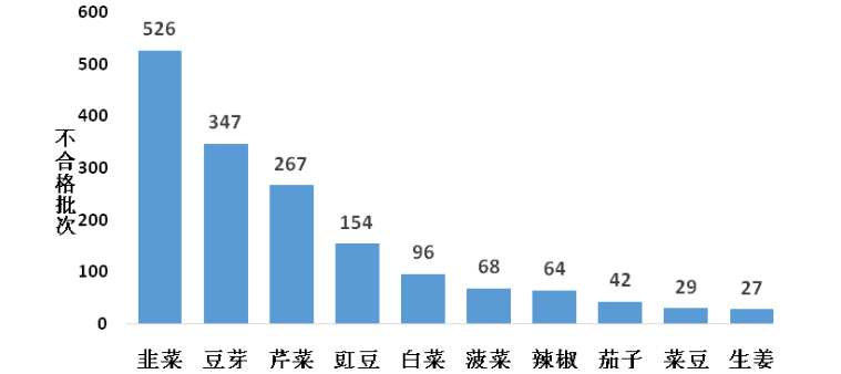 韭菜、豆芽、芹菜為農藥殘留超標最多的蔬菜產品。其中526批次韭菜檢出有農藥殘留超標,其中腐霉利殘留超標352批次、鎘被檢出70批次;347批次豆芽檢出農藥殘留超標,其中4-氯苯氧乙酸鈉殘留超標280批次、6-芐基腺嘌呤殘留超標59批次;267批次芹菜檢出農藥殘留超標,其中毒死蜱被檢出146批次、甲拌磷被檢出42批次。另外,抽檢不合格頻次較多的蔬菜還有豇豆和白菜,豇豆中克百威被檢出52批次,滅蠅胺被檢出51批次,白菜中毒死蜱被檢出45批次(詳見圖2)。