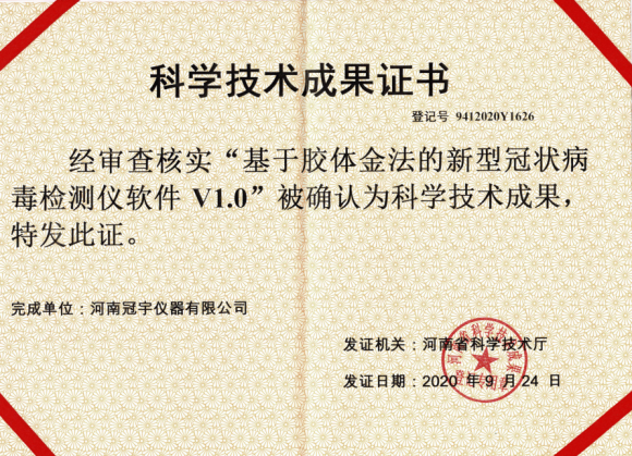 河南冠宇儀器有限公司(以下簡稱:冠宇儀器)繼多項軟件著作權證書、實用新型專利證書、計算機軟件著作權等一系列證書之后,又獲由河南省科學技術廳頒發的一項“基于膠體金法的新型冠狀病毒檢測儀軟件V1.0科學技術成果證書”,一系列的權威肯定,彰顯了冠宇儀器強大的技術研發能力,也體現出公司為客戶提供優質產品的強大決心。