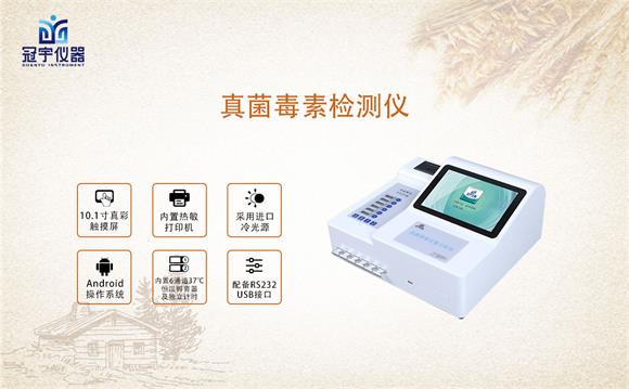 真菌性污染對人們的危害不容忽視,要加強相應的監管檢控工作,冠宇儀器GY-710真菌毒素殘留定量分析儀應用競爭抑制免疫層析的原理,通過檢測線熒光定量卡中的熒光強弱程度,定量分析待檢樣品中真菌毒素殘留含量。真菌毒素快速檢測儀能夠快速定量檢測糧食、飼料、谷物、食用油、調味品等食品中T2毒素、嘔吐毒素、赭曲霉毒素、伏馬毒素、玉米赤霉烯酮,真菌毒素殘留定量分析儀適用于糧油監測中心、糧油飼料生產加工、食品加工貿易、畜禽養殖戶自查、工商質監部門用于市場快速篩查等。