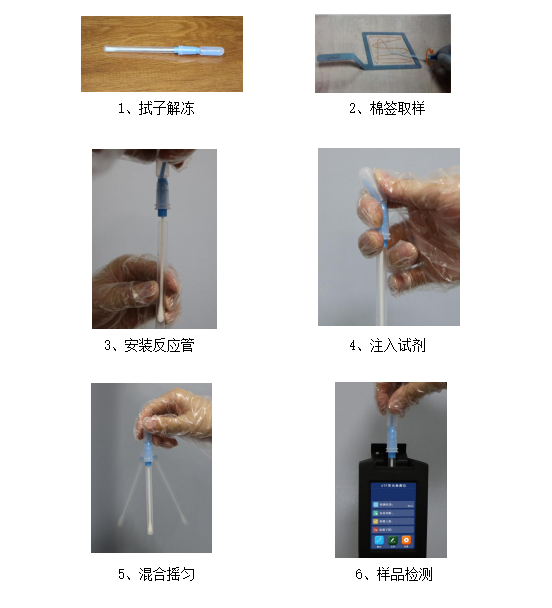 6、樣本檢測:將拭子插入處于待檢測界面的ATP儀器實驗倉內,閉合儀器上蓋,開始檢測。