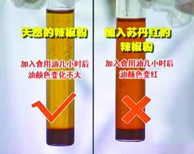1.4:辣椒粉簡易測試蘇丹紅方法:可將辣椒粉放入試管中,加入食用油。顏色變化不大,則可認為無添加蘇丹紅,若顏色變紅,則認為可能添加蘇丹紅等油溶性非食用色素。