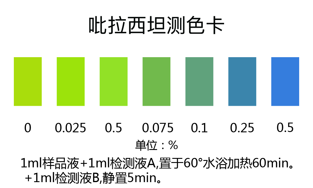 取上述濾液0.5 ml于玻璃比色皿或試管中,加入0.5 ml檢測液A,置于60°C水浴加熱60min,加入0.5 ml檢測液B,靜置5min,對照色卡比色,吡拉西坦含量越高,顏色越深;