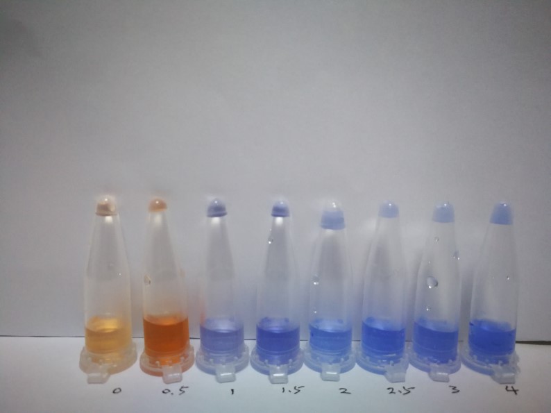 1.2:各吸取0.5mL樣品液和純水于離心管中,依次加2滴檢測試劑A和2滴檢測試劑B。
